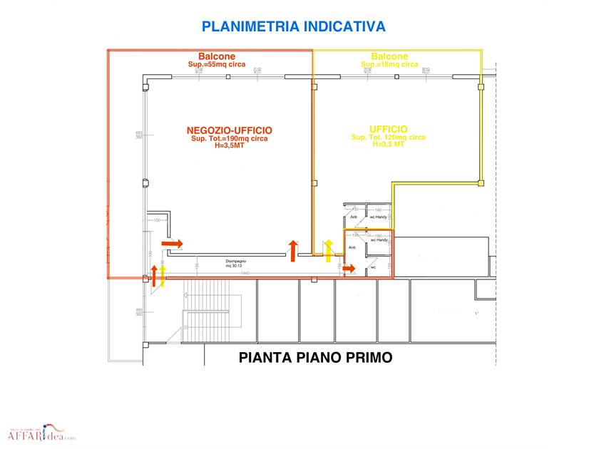 CESENA - CITTA'. Negozio-Ufficio in ottima posizione di passaggio, di circa 310mq con circa 73mq di balcone con superficie commerciale complessiva di circa 330mq, H=3,5mt con destinazione d'uso "Esercizio di Vicinato" per vendita al dettaglio, e/o possibilità di ufficio. L'immobile internamente viene consegnato finito con bagni ed è collocato al piano primo senza ascensore. La struttura commerciale è completa di circa un centinaio di parcheggi pubblici gratuiti, adibiti all'attività con possibilità di avere circa cinque parcheggi in esclusiva.