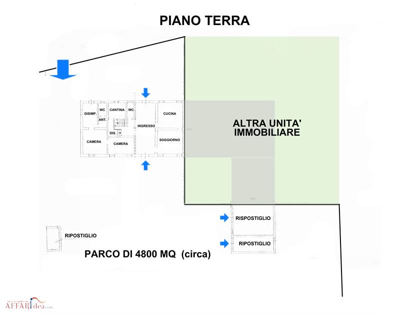 Separatamente troviamo i servizi come garage, cantina, ripostiglio.